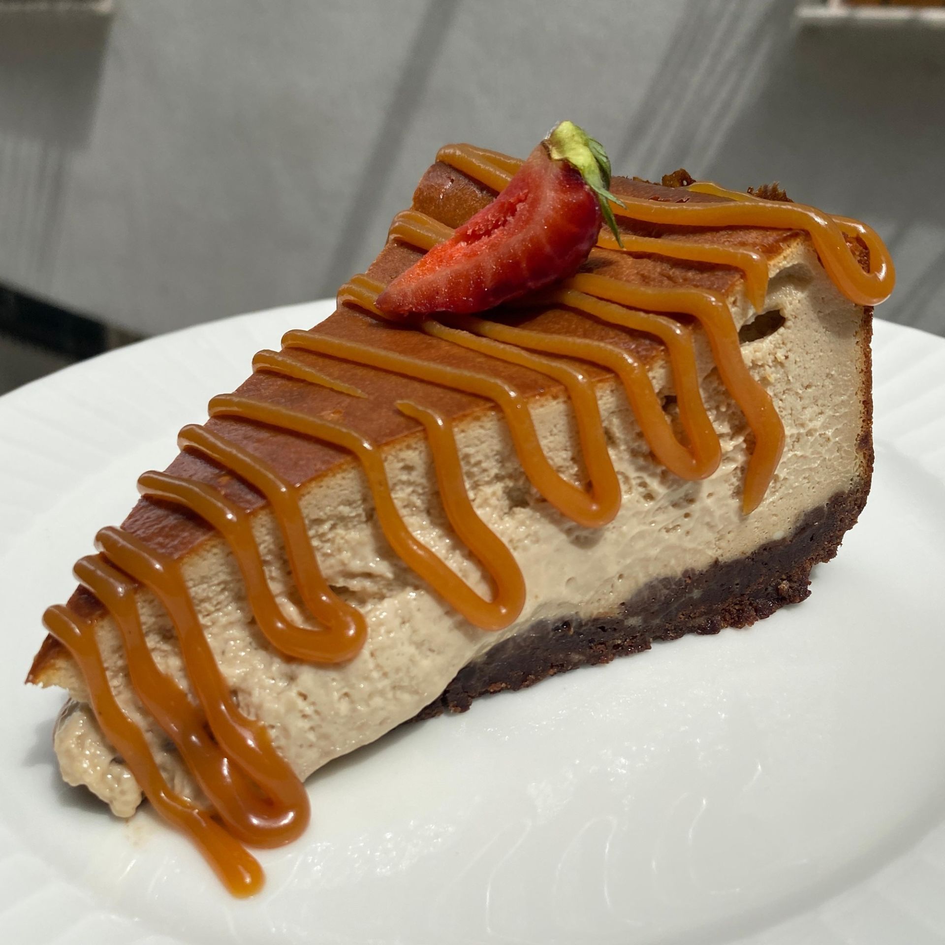 Üzeri karamel soslu, kakaolu bisküvi tabanında hazırlanmış, kahveli San Sebastian Cheesecake