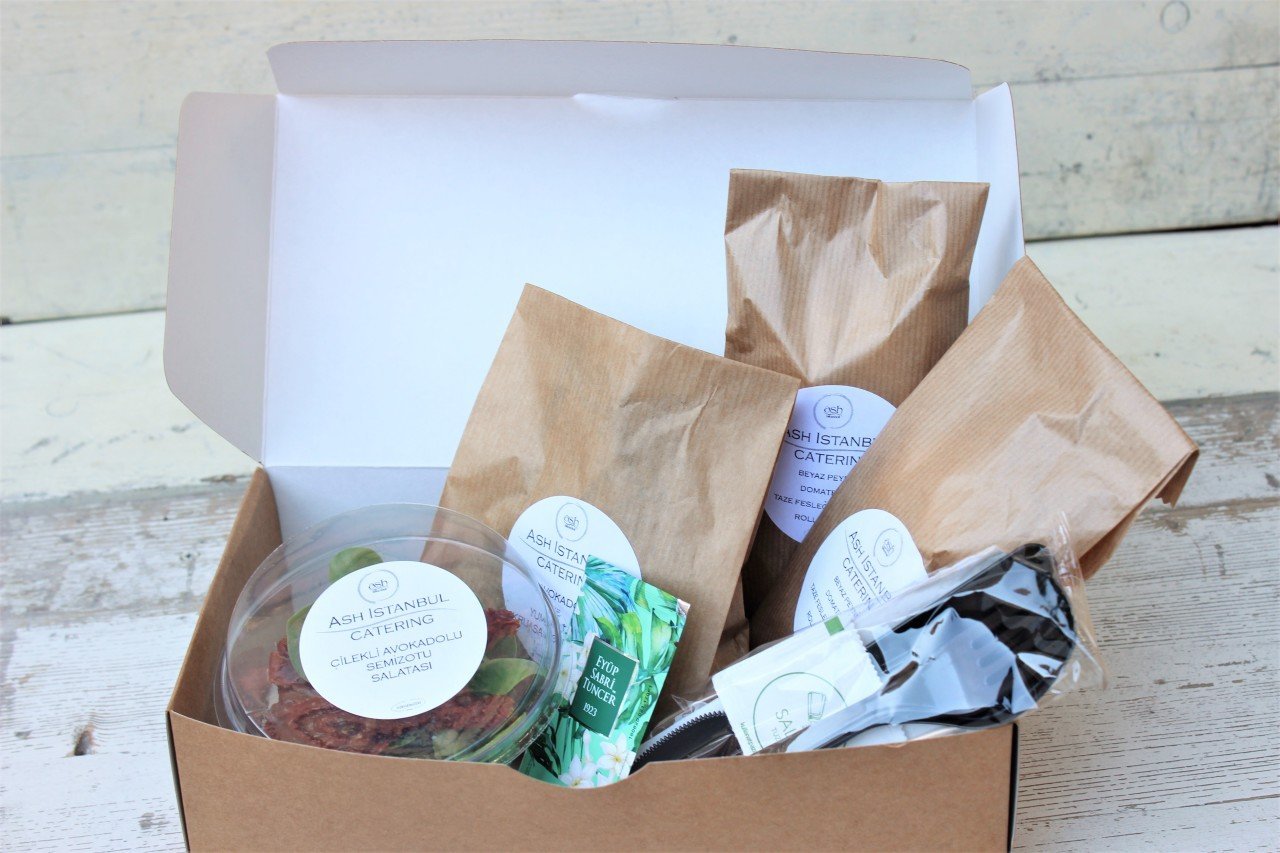 Sandviç paketlerimiz özel kutularda tek kullanımlık çatal-kaşık-bıçak, kağıt peçete ve ıslak mendil ile gönderilir.